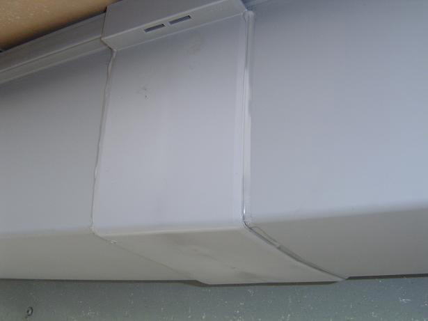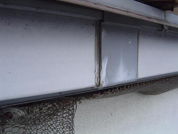 | 大型の建物専用、折板屋根用の軒樋です。 既存は、プラスチック製でした。 ジョイントの接続部分の、コーキングが切れています。 隙間があるのが見えますね。 色も紫外線などにより、褪色・変色しています。 |