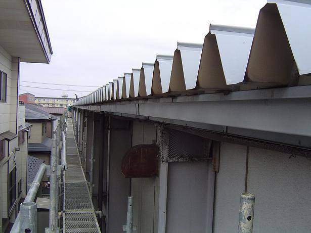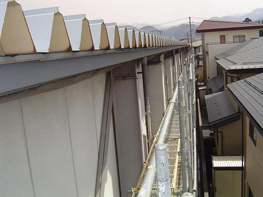 大型の建物で、雨水が1方向に集まる、片流れの屋根ですので、 こちらの面にだけ軒樋があります。 屋根の流れ長さ 18M、軒樋が 75Mでは、 かなりの量の雨水が集まりますね。 雨漏りしていた部分は、滝のようでした。 |
