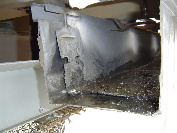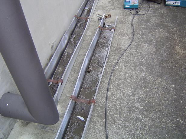| 解体した軒樋です。 かなりの量の泥が溜まっています。 金物も真っ赤にさびていますね。 軒樋自体も、熱により、湾曲しています。 いつも、過酷な条件下で働いている雨樋なのです。 |
