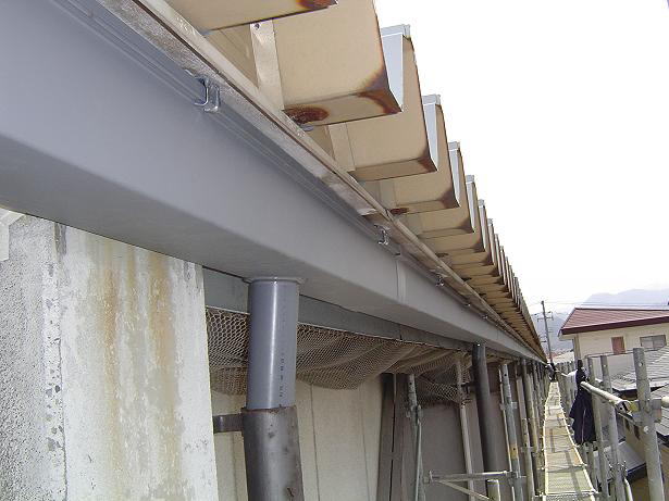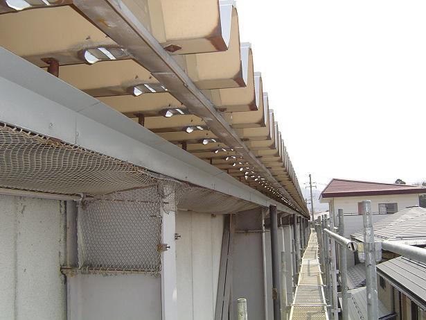 工場や店舗で使用されている、大型雨樋の交換工事です。
