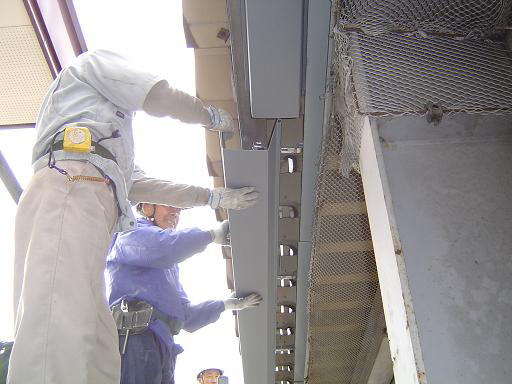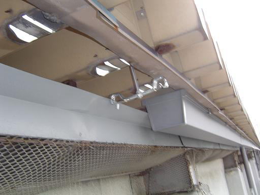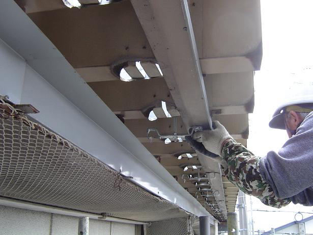 | 古い金物と、軒樋が撤去されました。 | 新しい吊り金物を取り付けていきます。 亜鉛メッキ製のさびにくい部材です。 |