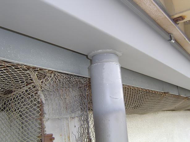 軒先の納まりです。 既存の鉄管に塩ビパイプでつないでいきます。 |