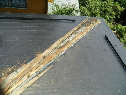 棟木包みのトタンをはがしてみると、棟木がぼろぼろです。 この下の部屋が雨漏りしていました。 |