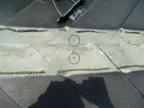 棟木を取り付けた釘穴が何箇所もあります。 屋根の上に、棟木が直接置いてあるので、水を吸って腐食がすすみ、 釘穴から雨漏りが始まります。 |