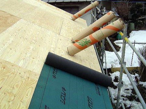 下地が出来たら、下葺きに防水ルーフィング処理をします。 これだけでも、雨は漏りません。 |